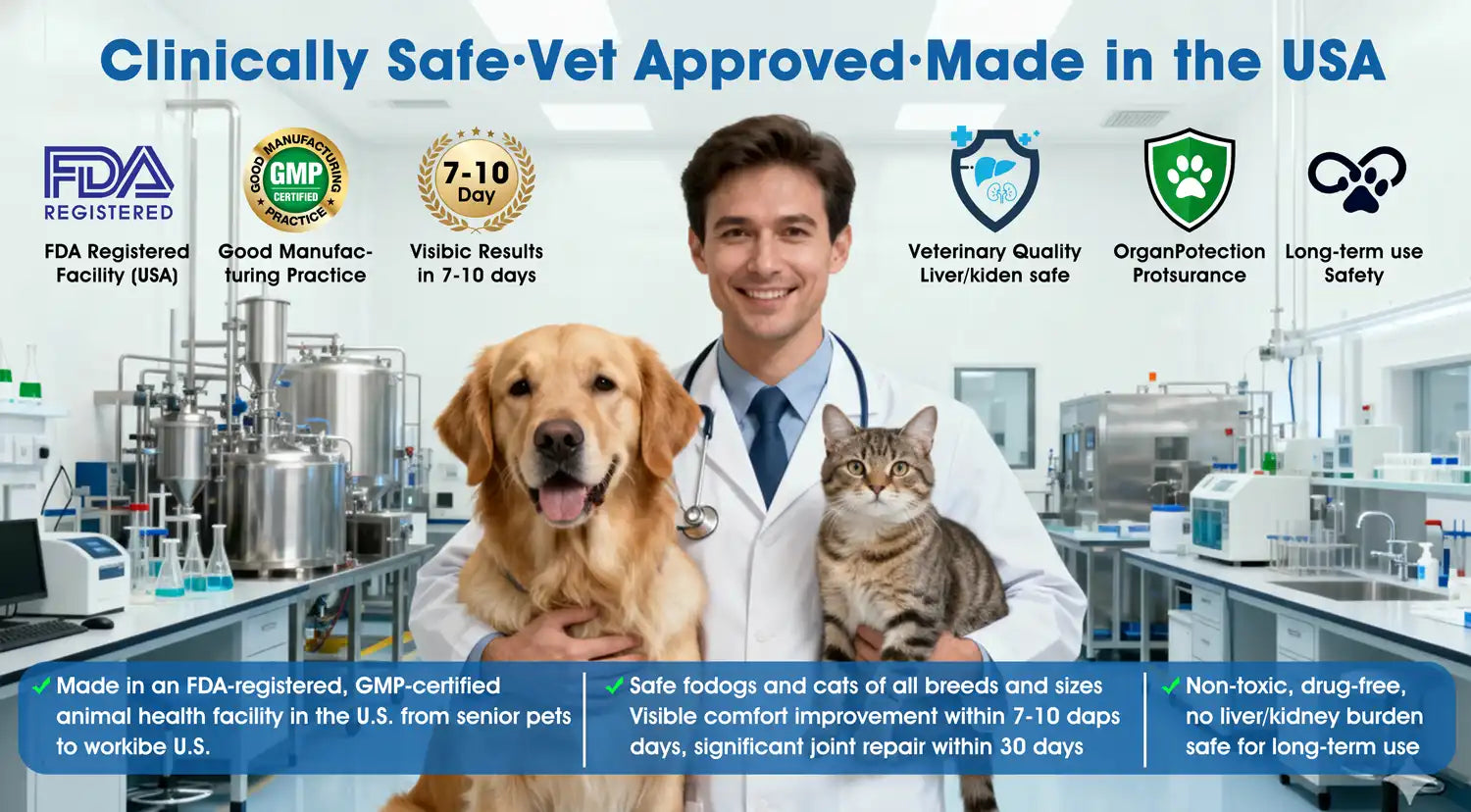 Made with bioactive pet-safe ingredients in a U.S. FDA-registered, GMP-certified animal health facility — gentle enough for long-term daily use with no known side effects.