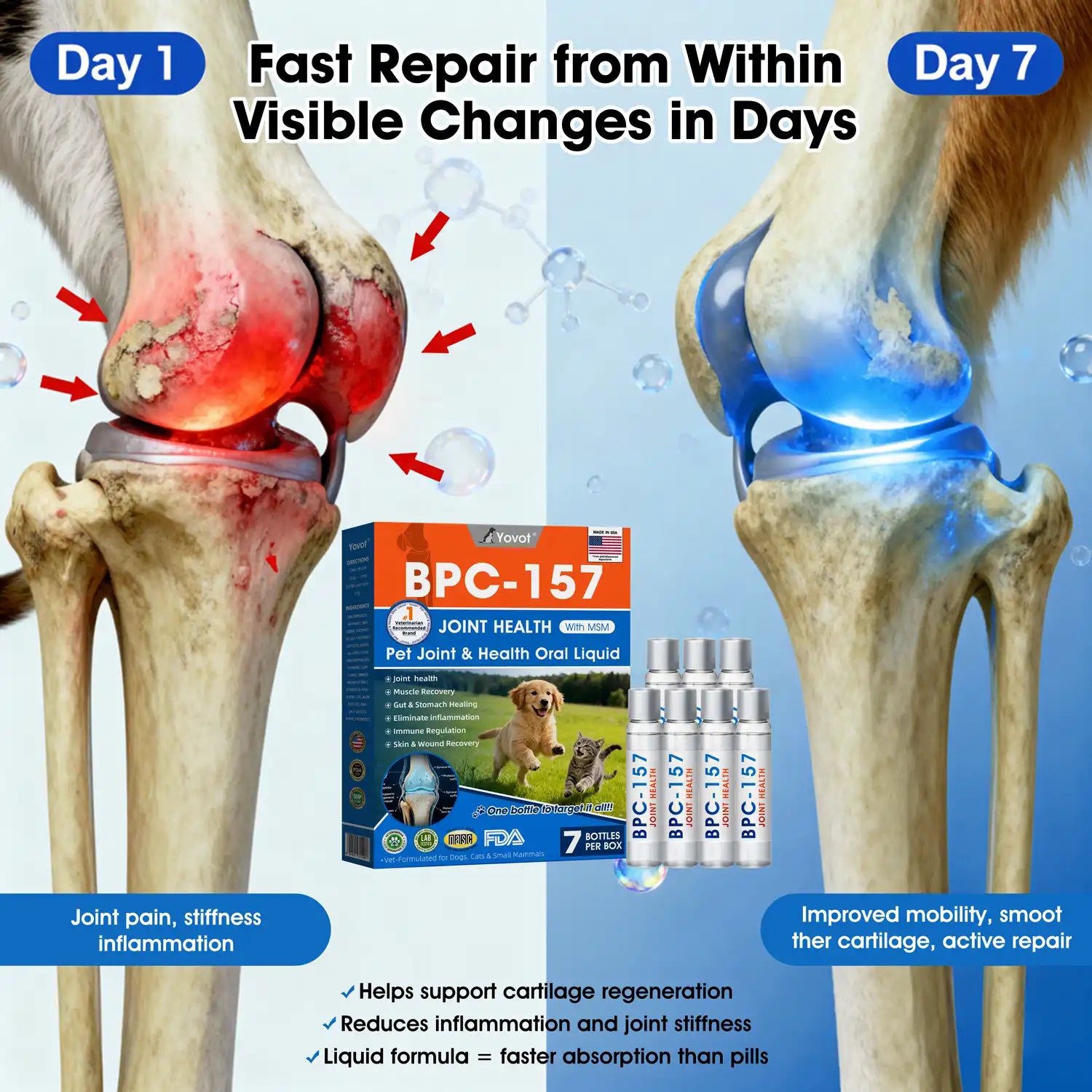 In veterinary trials across 12 animal rehabilitation centers in the U.S., dogs and cats suffering from arthritis, hip dysplasia, ligament injuries, and age-related joint degeneration were given Yovot® BPC-157 Pet Oral Liquid once daily. After 30 days:
