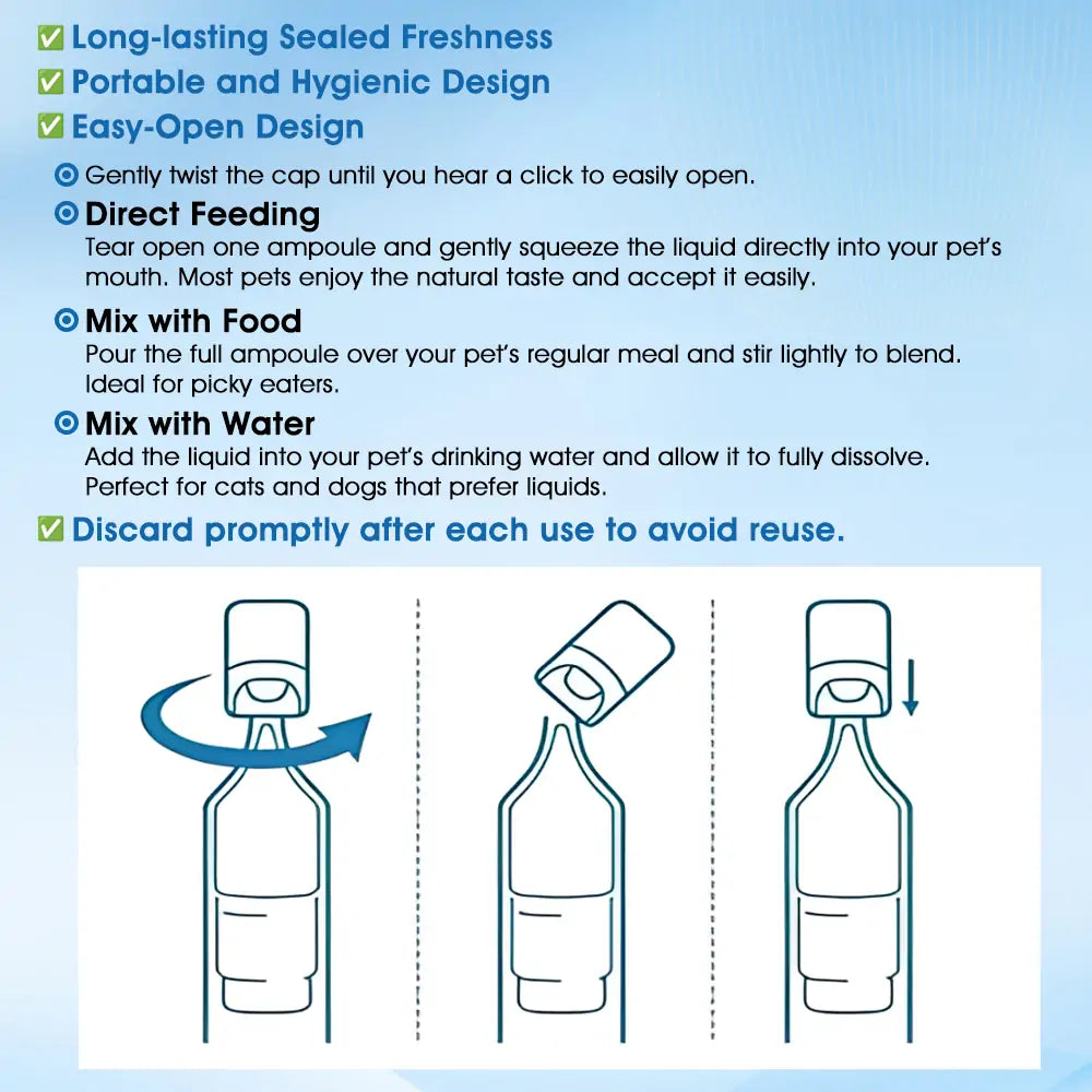 Simply feed once daily, ideally after meals. Liquid form ensures better absorption than powders or tablets. Most pet parents order 2–3 months of supply for full tissue and joint recovery.